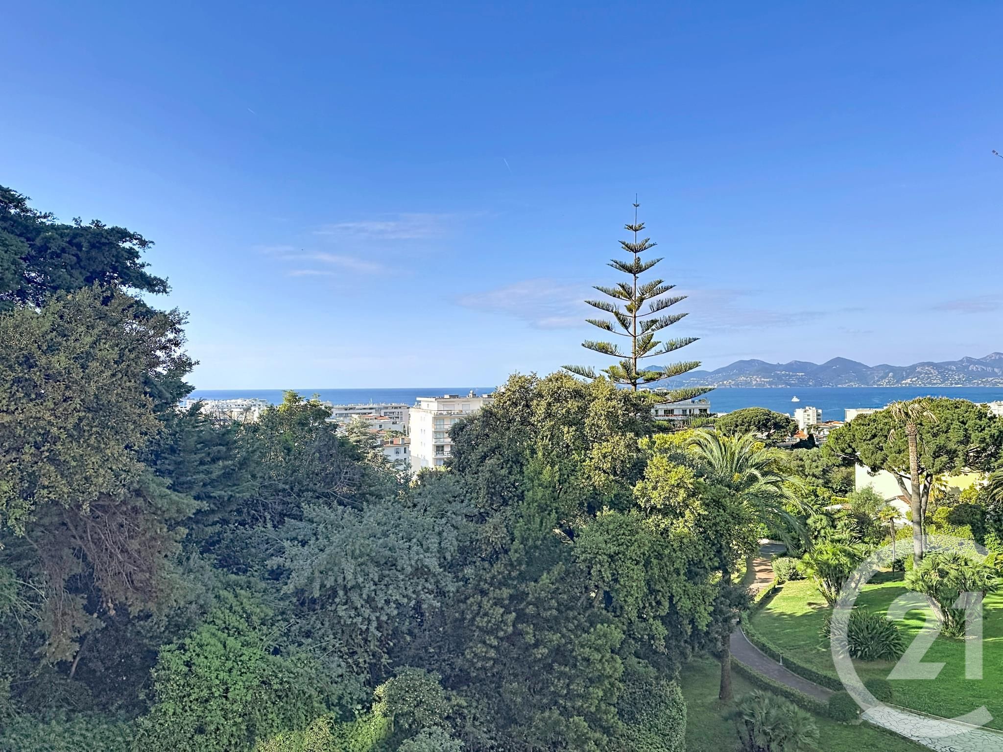 Profonde terrasse sud d'environ 10 m² offrant une très jolie vue verdure / parc et mer.